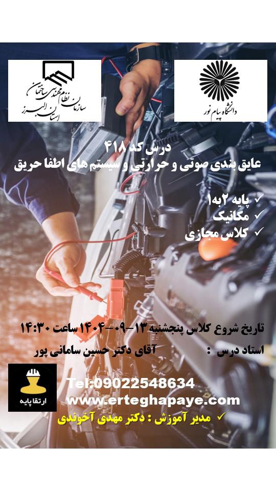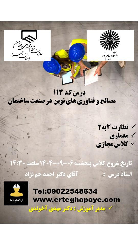 مهندس گرامی سلام به سایت ارتقا پایه دانشگاه پیام نور البرز خوش آمدید. با توجه به اینکه کلیه ثبت نام دوره های ورود به حرفه اجرا، ارتقا پایه و تمدید پروانه اشتغال می بایستی در سامانه جامع کشوری انجام گردد. جهت راهنمایی در انتخاب درست دوره ها لطفا بر روی دکمه ثبت نام دور های ابتدا کلیک کرده و کد کلاس های مورد نظر را یادداشت فرموده و در نهایت فیلم آموزش ثبت نام در سامانه جامع رو ملاحظه کرده و کد کلاس های مورد را در سامانه ثبت نام فرمایید.