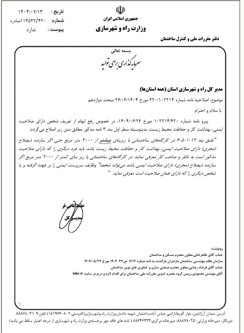 موضوع: اصلاحيه نامه شماره ٢٢٠/١٠٢٢١٢ مورخ 1404/06/26 مبحث دوازدهم