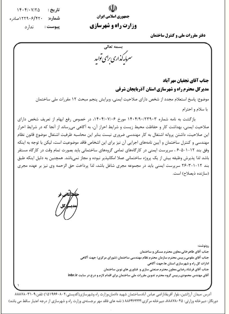 موضوع: پاسخ استعلام مجدد از شخص داراى صلاحيت ايمنی، ويرايش ينجم مبحث ١٢ مقررات ملی ساختمان