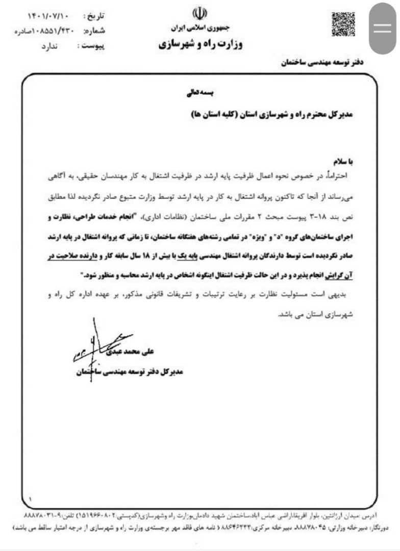 احتراماً، در خصوص نحوه اعمال ظرفيت بايه ارشد در ظرفيت اشتغال به كار مهندسان حقيقی، به آگاهی میرساند از آنجا كه تا كنون پروانه اشتغال به كار در پايه ارشد توسط وزارت متبوع صادر نگرديده لذا مطابق نص بند ١٨-٣ پيوست مبحث ٢ مقررات ملی ساختمان (نظامات اداری)، “انجام خدمات طراحی، نظارت و اجرای ساختمانهای گروه “د” و”ویژه” در تمامی رشتههای هفتگانه ساختمان، تا زمانی كه پروانه اشتغال در پايه ارشد صادر نگرديده است توسط دارندگان پروانه اشتغال مهندسی پايه یک با بیش از ١٨ سال سابقه كار و دارنده صلاحيت در آن گرايش انجام پذيرد و در اين حالت ظرفيت اشتغال اينگونه اشخاص در پايه ارشد محاسبه و منظور شود.”