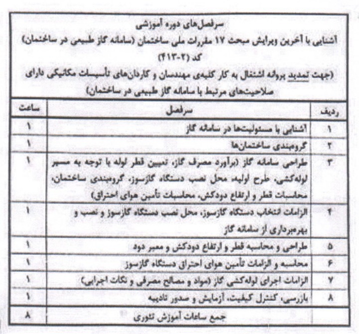 موضوع ابلاغ سرفصلهاى دوره آموزشی آشنايی با آخرين ویرايش مبحث ١٧ مقررات ملی ساختمان (سامانه گاز طبيعی در ساختمان)، كد(413-2)