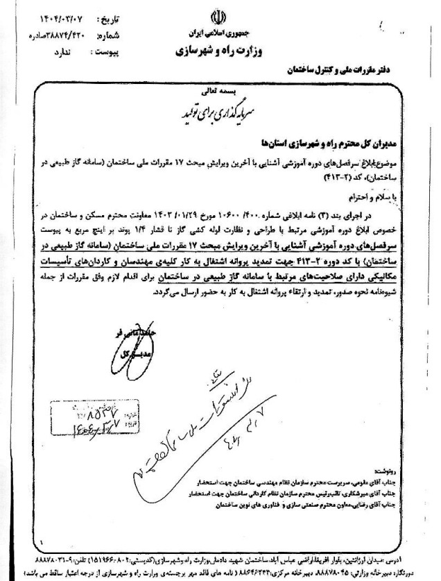 در اجراى بند (٣) نامه ابلاغی شماره ١٠٤٠٠ /٢٠٠ مورخ ١4٠٣/٠١/٢٩ معاونت محترم مسكن و ساختمان در خصوص ابلاغ دوره آموزشی مرتبط با طراحى و نظارت لوله كشی گاز تا فشار ١٢٣ پوند بر اينچ مربع به پيوست سرفصلهای دوره آموزشی آشنايی با آخرين ويرايش مبحث ١٧ مقررات ملی ساختمان (سامانه گاز طبيعی در ساختمان) با كد دوره 413-2 جهت تمديد پروانه اشتغال به كار كليهى مهندسان و كاردانهای تأسيسات مكانيكی دارای صلاحيتهای مرتبط با سامانه گاز طبيعی در ساختمان برای اقدام لازم وفق مقررات از جمله شيوهنامه نحوه صدور، تمديد و ارتقاء پروانه اشتغال به كار به حضور ارسال مى گردد.